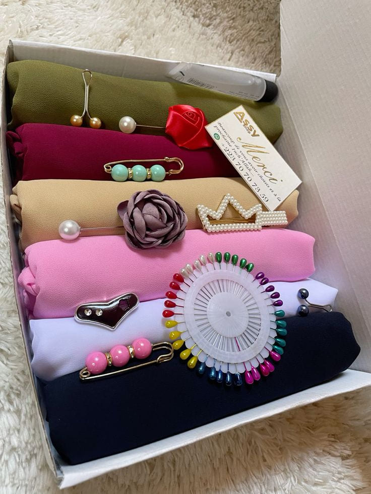 - 6 Hijabs soigneusement pliées, aux couleurs variées parfaites pour différents looks de tous les jours.
